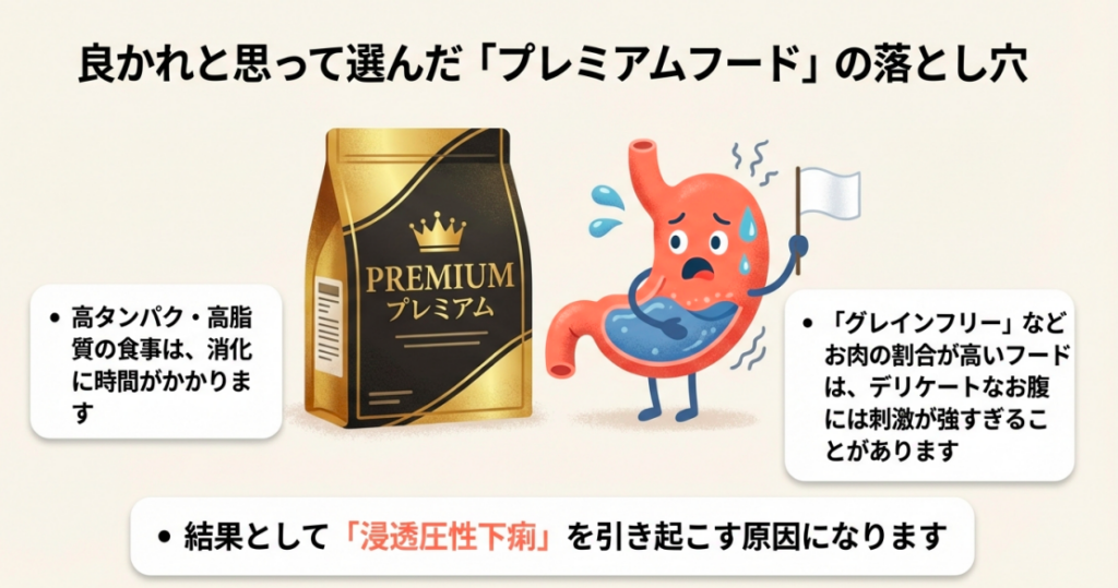 プレミアムフードは栄養価が高い分、デリケートな子にとっては脂肪分が刺激になりすぎてしまうことがあります。
