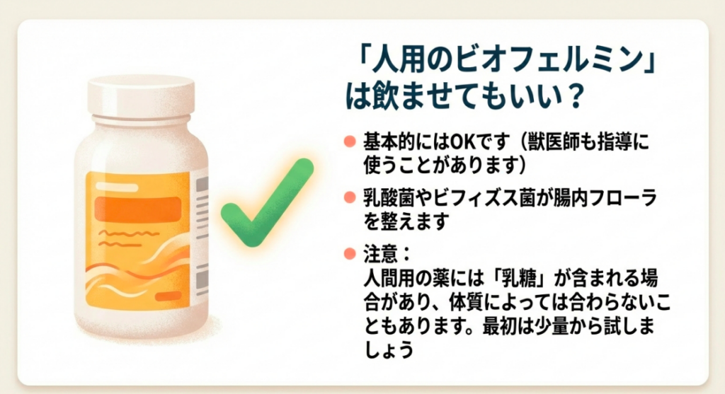 飼い主さんの間でよく話題になるのが、「人間用のビオフェルミンを飲ませてもいい?」という疑問。