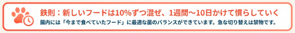 新しいフードへ移行する際は、今のフードに10%ずつ混ぜて、最低でも1週間から10日かけて慎重に慣らしていくのが、お腹を壊さないための鉄則ですね!