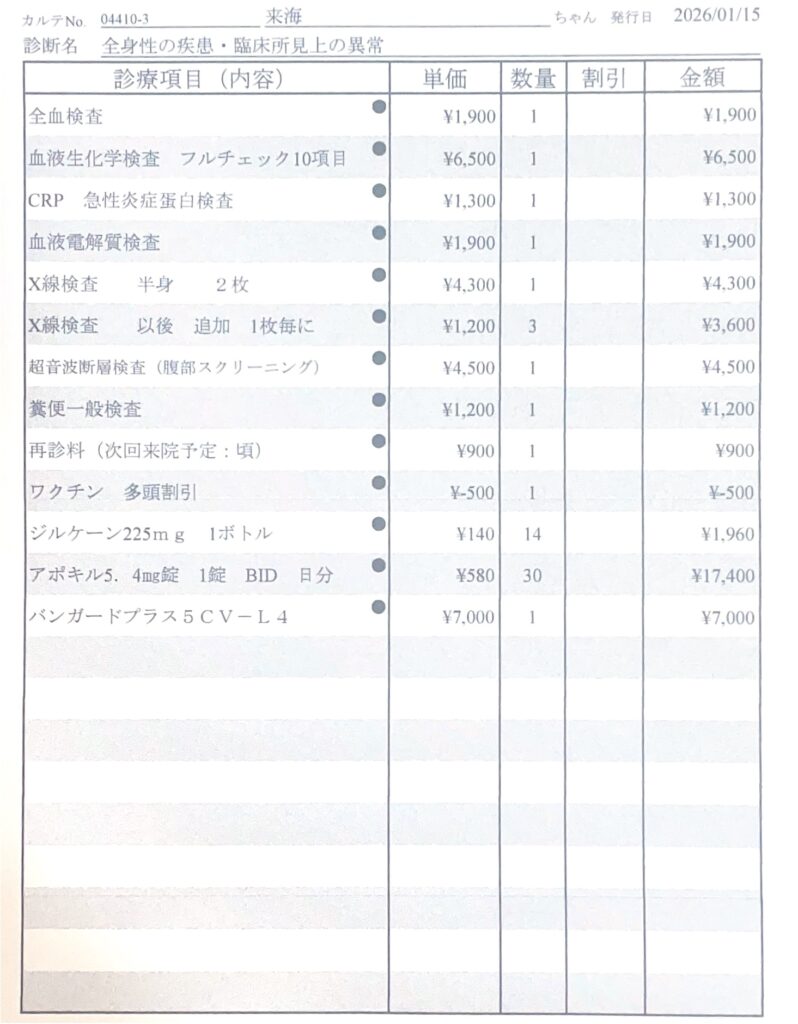 病院受診時時の写真は、ワクチンやアレルギー薬の値段も入ってますが、しっかり検査をすると3万円くらいします!