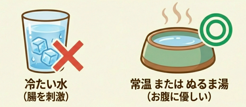 冷たい水は腸を刺激して逆効果になることがあるので、必ず常温の水、またはぬるま湯を用意してあげてくださいね!