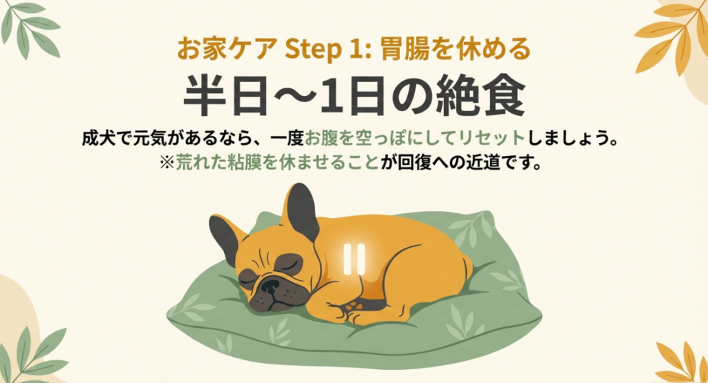 成犬で元気があるなら、半日から最大1日程度の絶食を行い、お腹を空っぽにしてあげるのが効果的ですよ。
