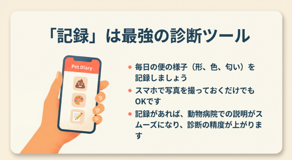 お留守番中の不安をゼロにするためにも、毎日の便の様子(形、色、匂い)をアプリなどで記録しておくと、変化にすぐ気づけますし、病院での説明もスムーズになりますよ!