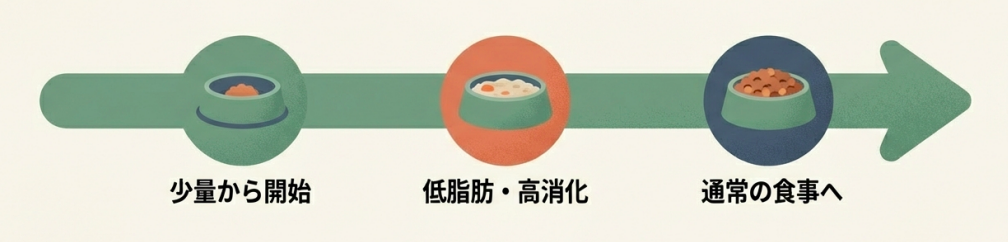 いきなり元のプレミアムフード(特に高脂肪なもの)に戻すと、せっかく落ち着いた腸が再びびっくりしてしまいます。