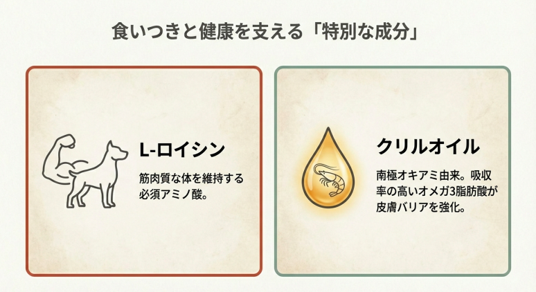 食いつきが改善?原材料のLロイシンとクリルオイル