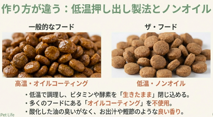 一方、ザフード(特にTHE fu-do)が採用している「低温押し出し製法」は、原材料の酵素やビタミンをできるだけ「生きている」状態で閉じ込めるようにしています。