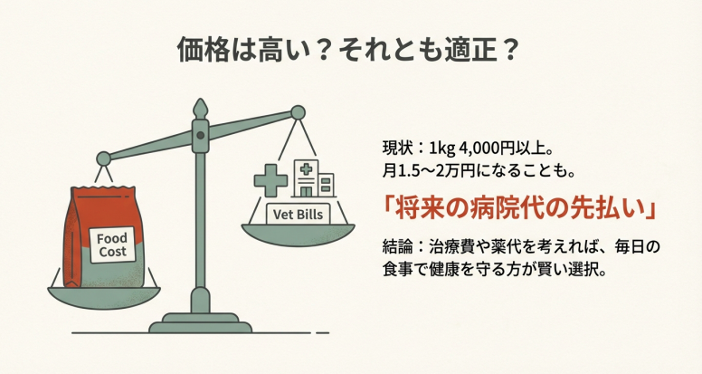 1kgあたり4,000円を超えることもあり、市販のフードに慣れていると「えっ、こんなにするの!?」とびっくりしちゃいますよね……。