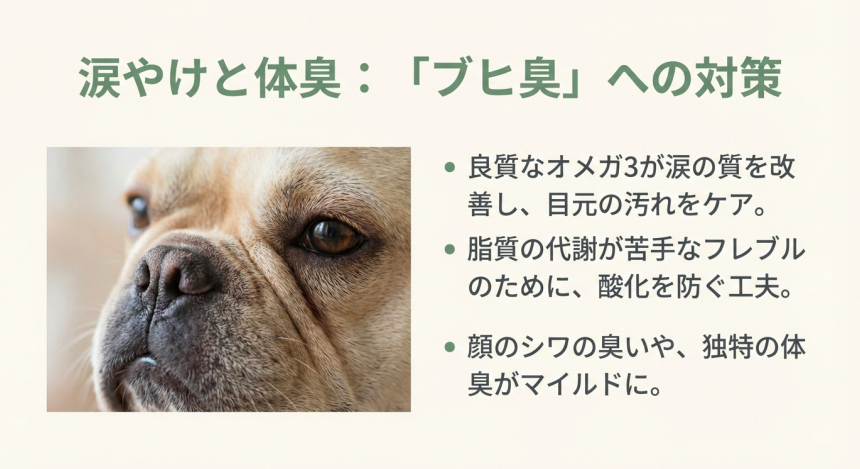フレブル飼い主さんの悩みの「涙やけ」、「体臭」。
