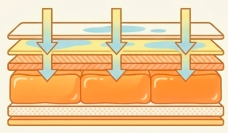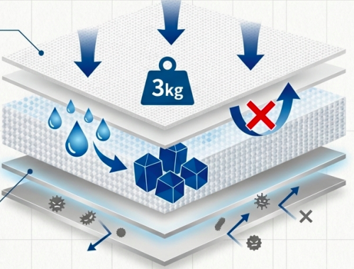 表面のポリオレフィン系不織布が尿を瞬時に下層へ誘導し、高分子吸水材(SAP)がゼリー状に固めて逆戻りを防ぐ仕組みになっています。