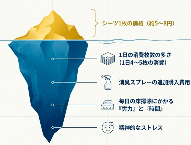 • 床拭き・消臭スプレー代などの「隠れコスト」も含めて計算することが大切