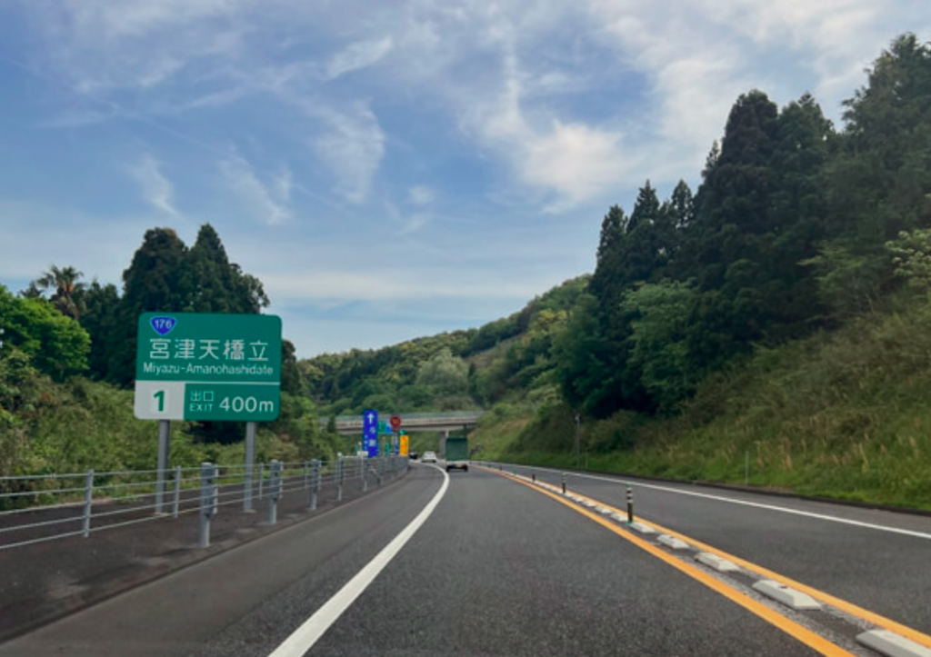 右手に天橋立を見ながら走ることができますよ!有料道路降りた後は、大体30分くらいです。