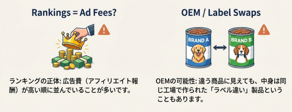 このあたりの深い裏話は、ドッグフードランキングの大嘘を暴く!OEMと広告の不都合な真実で詳しく解説しているので、騙されたくない飼い主さんは必見ですよ!