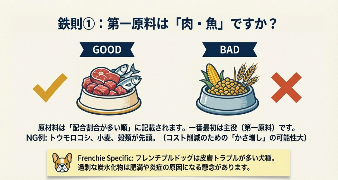 - 第一原料が動物性原料(肉や魚)であること: 穀物でかさ増しされていないかチェック!