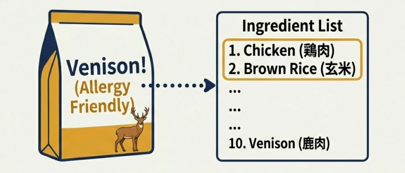 フレンチブルドッグのようにアレルギーを気にする子を狙って、「鹿肉使用!」とデカデカと宣伝しているフードは多いですが、実際はその手前にある「鶏肉」や「玄米」が中身の9割を占めている、なんてことも……。