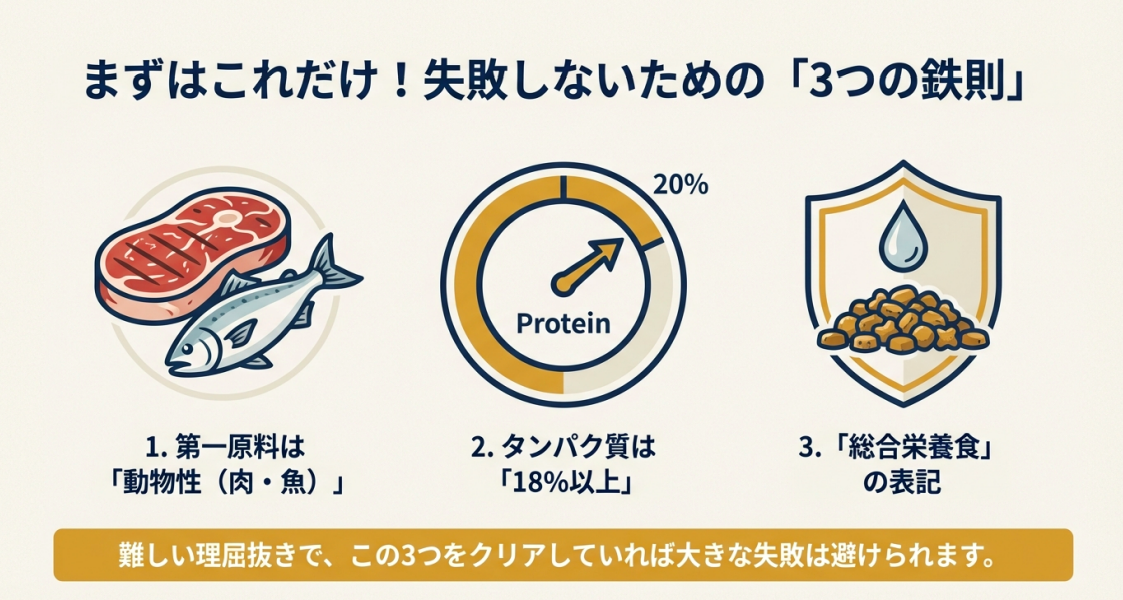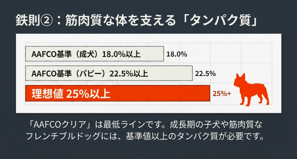 - AAFCO基準のタンパク質18%以上をクリアしているか確認する重要性