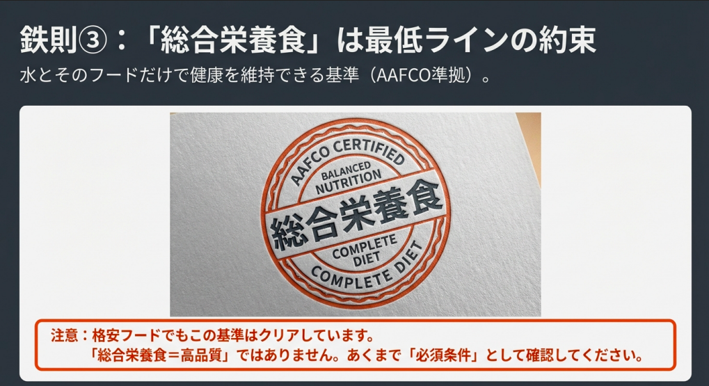 - 「総合栄養食」と明記されていること: 水とそのフードだけで栄養が完結するか!